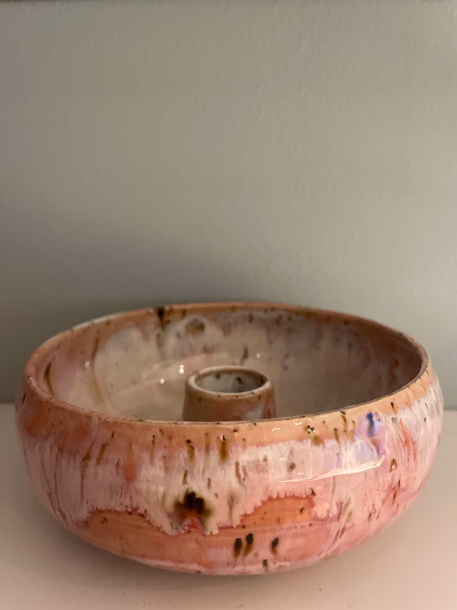 Denne lysestaken er dreid i en lys leire i steingods, glasert i den vakre fargen villrose – en myk blanding av rosa toner med et organisk, levende uttrykk. Den brede formen gir et stabilt underlag og skaper et elegant blikkfang på bordet, hyllen eller i vinduskarmen. Perfekt for både hverdag og høytid.