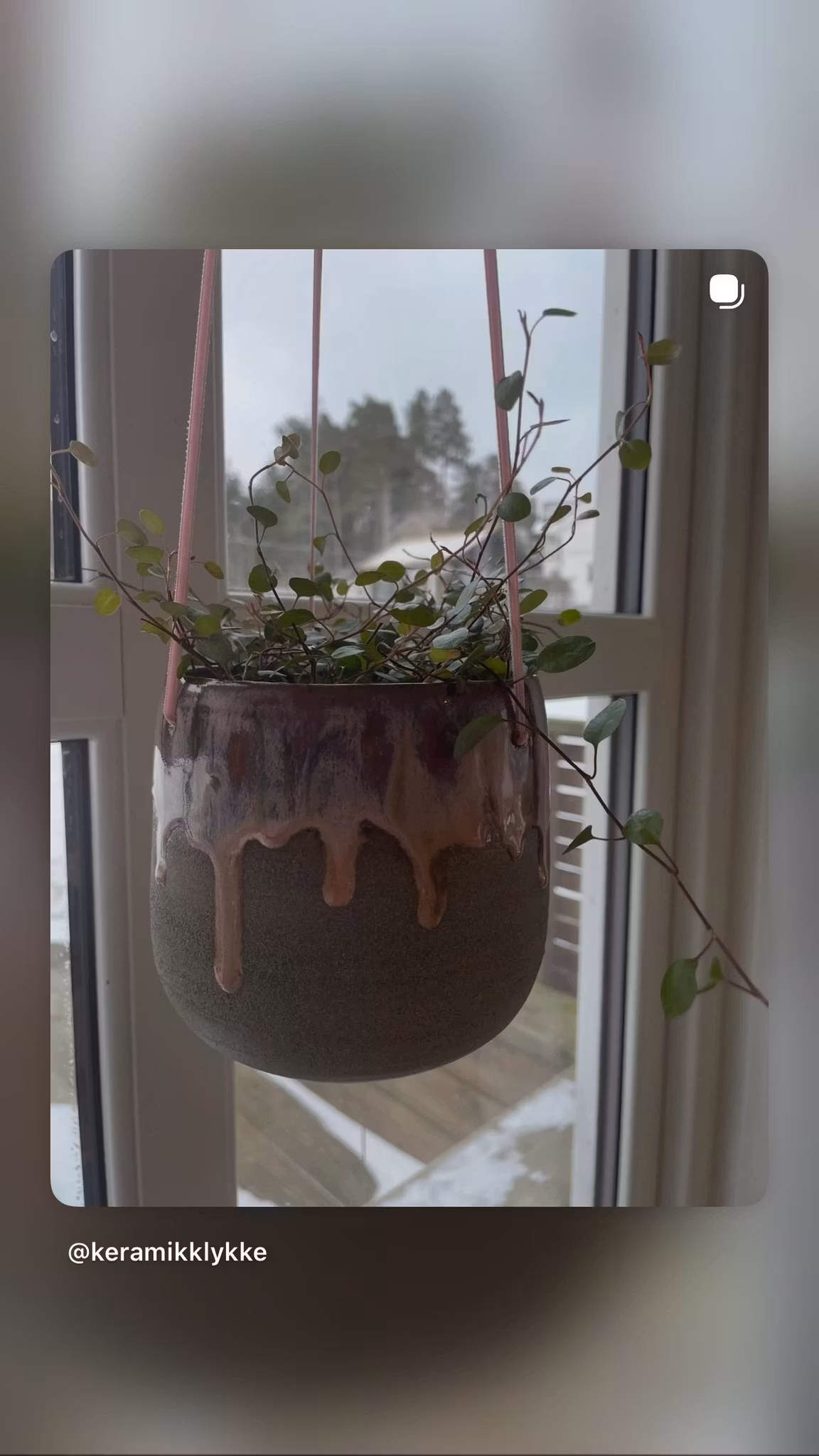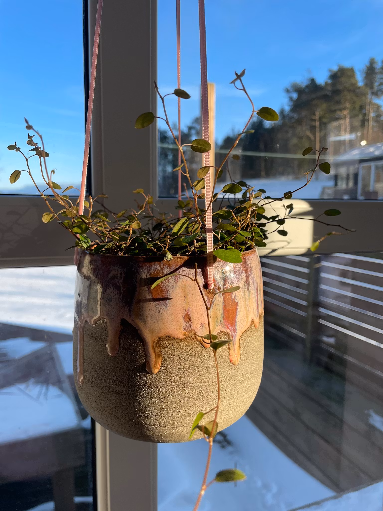 Hengepotte med villroseglasur, laget for å gi liv til vinduet. Den grå steingodsleiren står i fin kontrast til glasuren, og de rennende partiene gir hver potte sitt eget, levende uttrykk. Når potten henger i lyset, får både fargespill og overflate komme ekstra godt til sin rett.