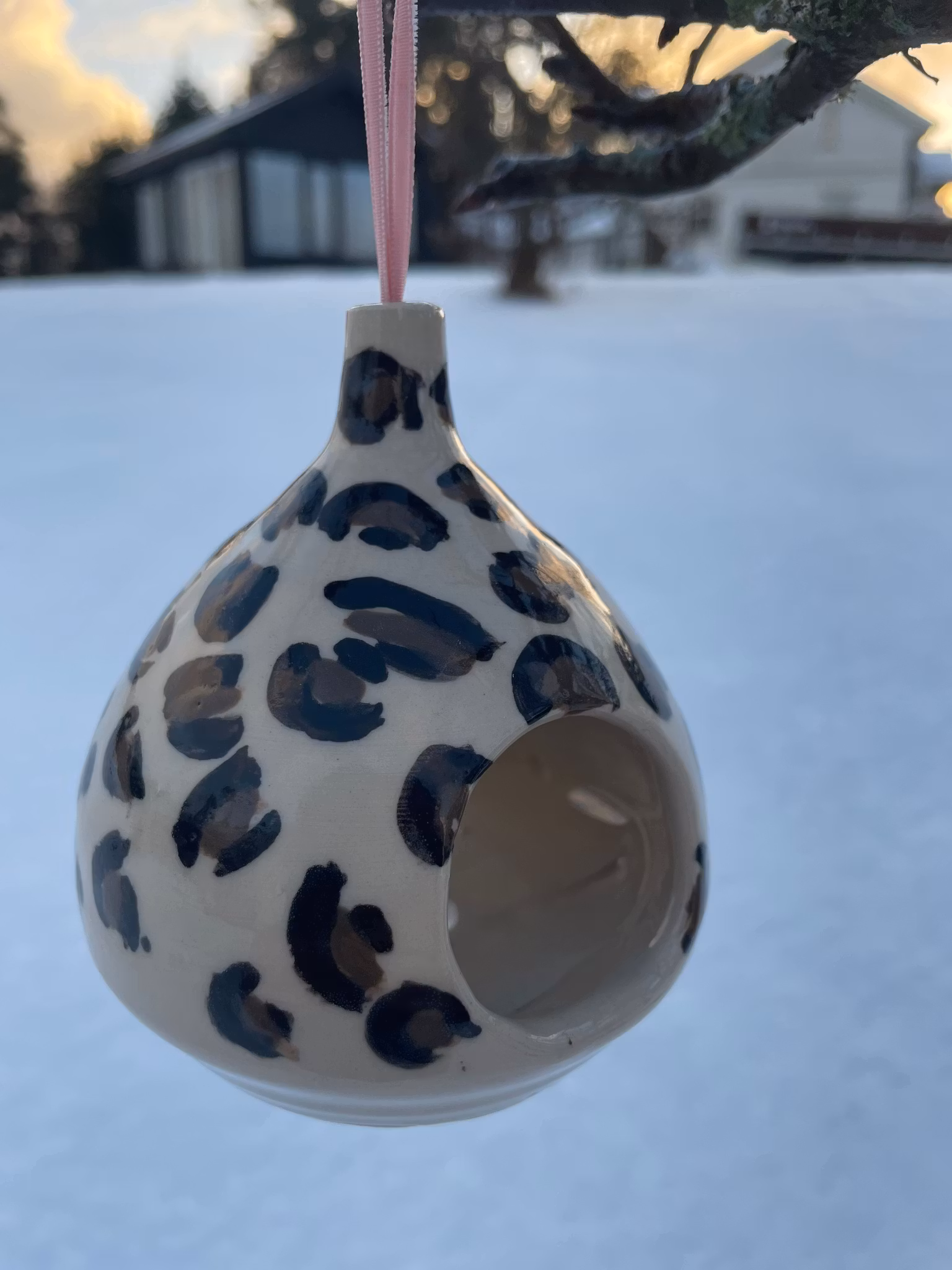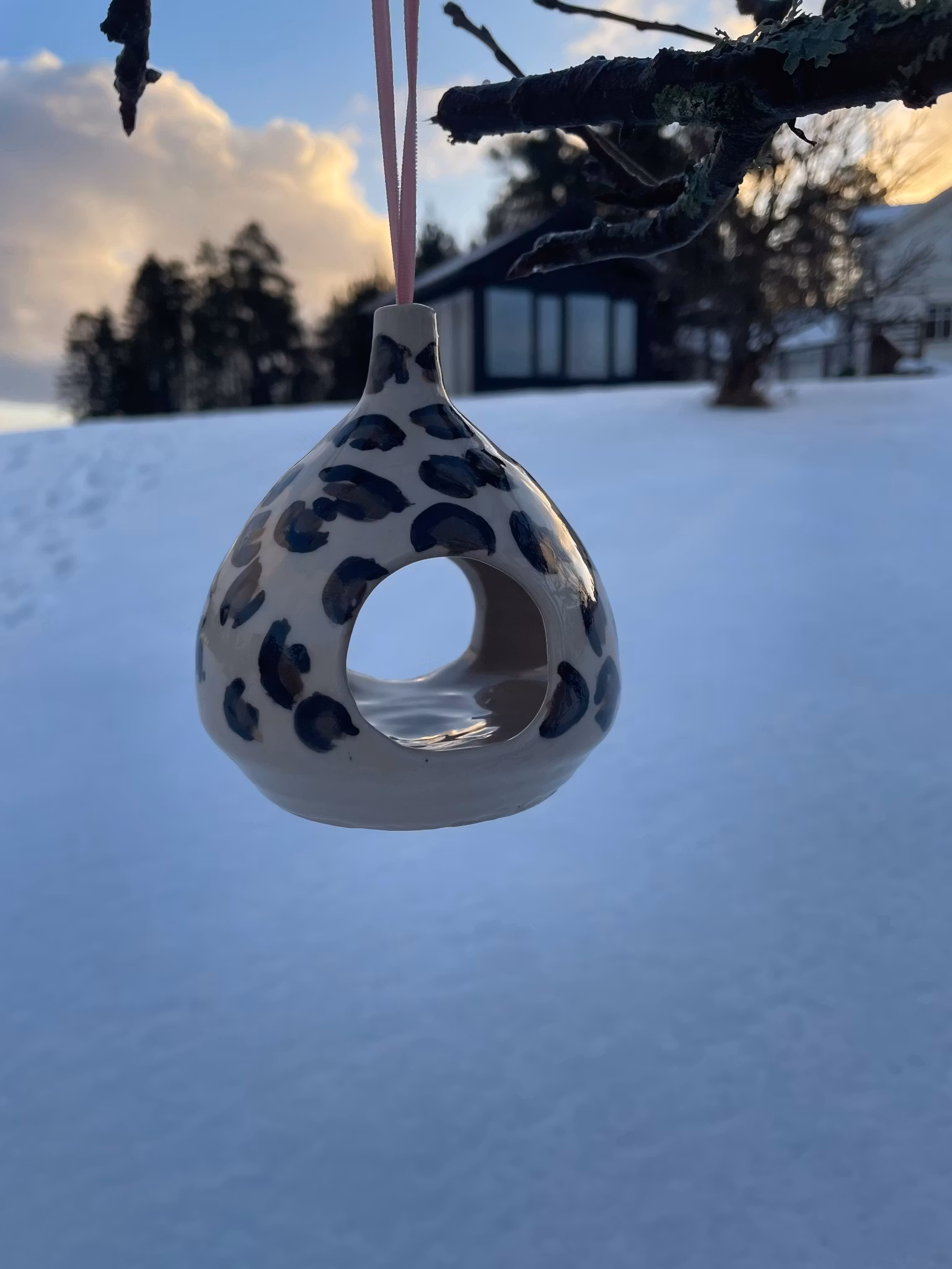 En fuglemater i steingodsleire, laget for å henge i epletreet eller utenfor vinduet. Den lille åpningen gir fuglene ly og en trygg plass å lande.