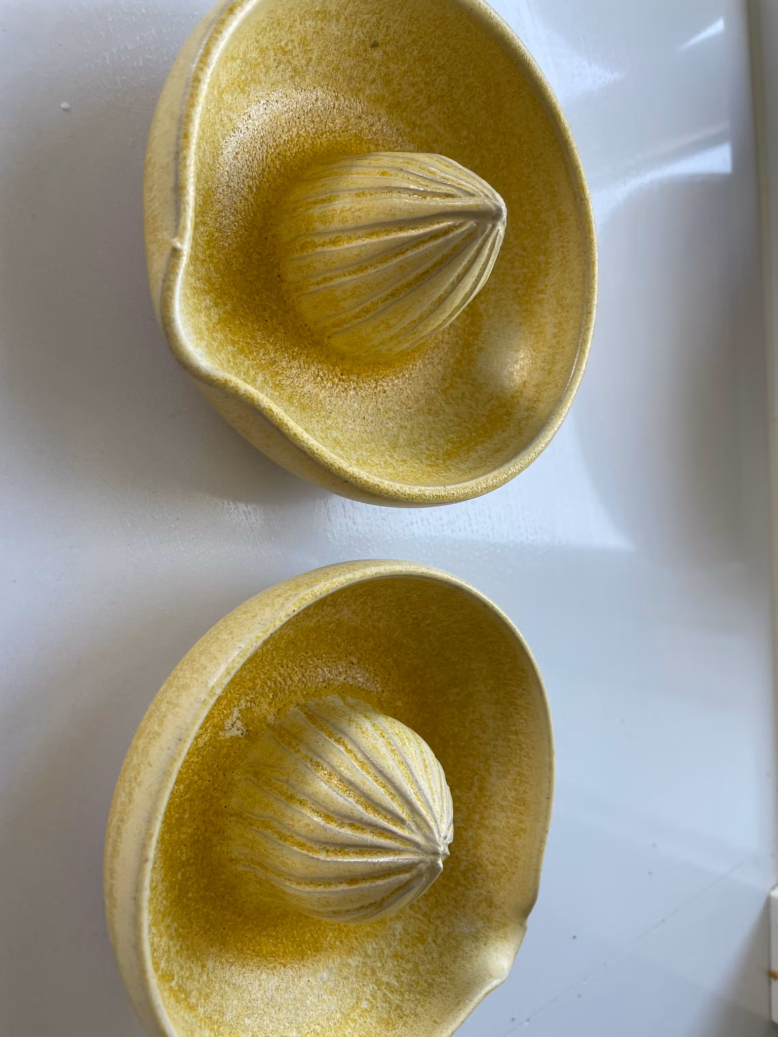 Når livet gir deg sitroner – press dem med stil. Denne hånddreide sitruspressen er laget i steingods og kommer i en nydelig gul glasur som gjør den like dekorativ som den er praktisk. Den ligger godt i hånden, samler saften effektivt og tåler hverdagsbruk.